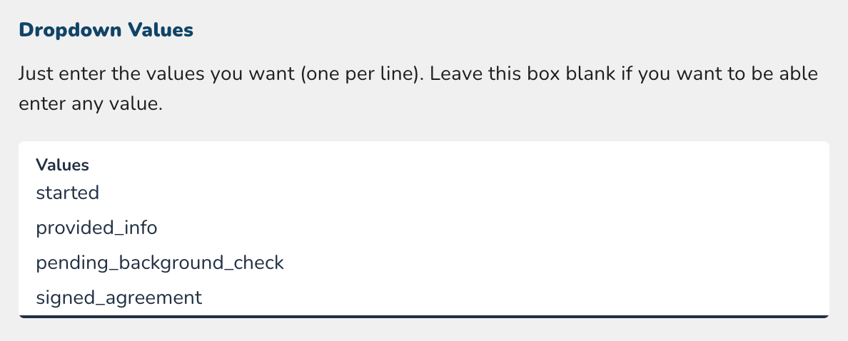 Example: If you're tracking Onboarding, you could create an Onboarding Status field with dropdown values: