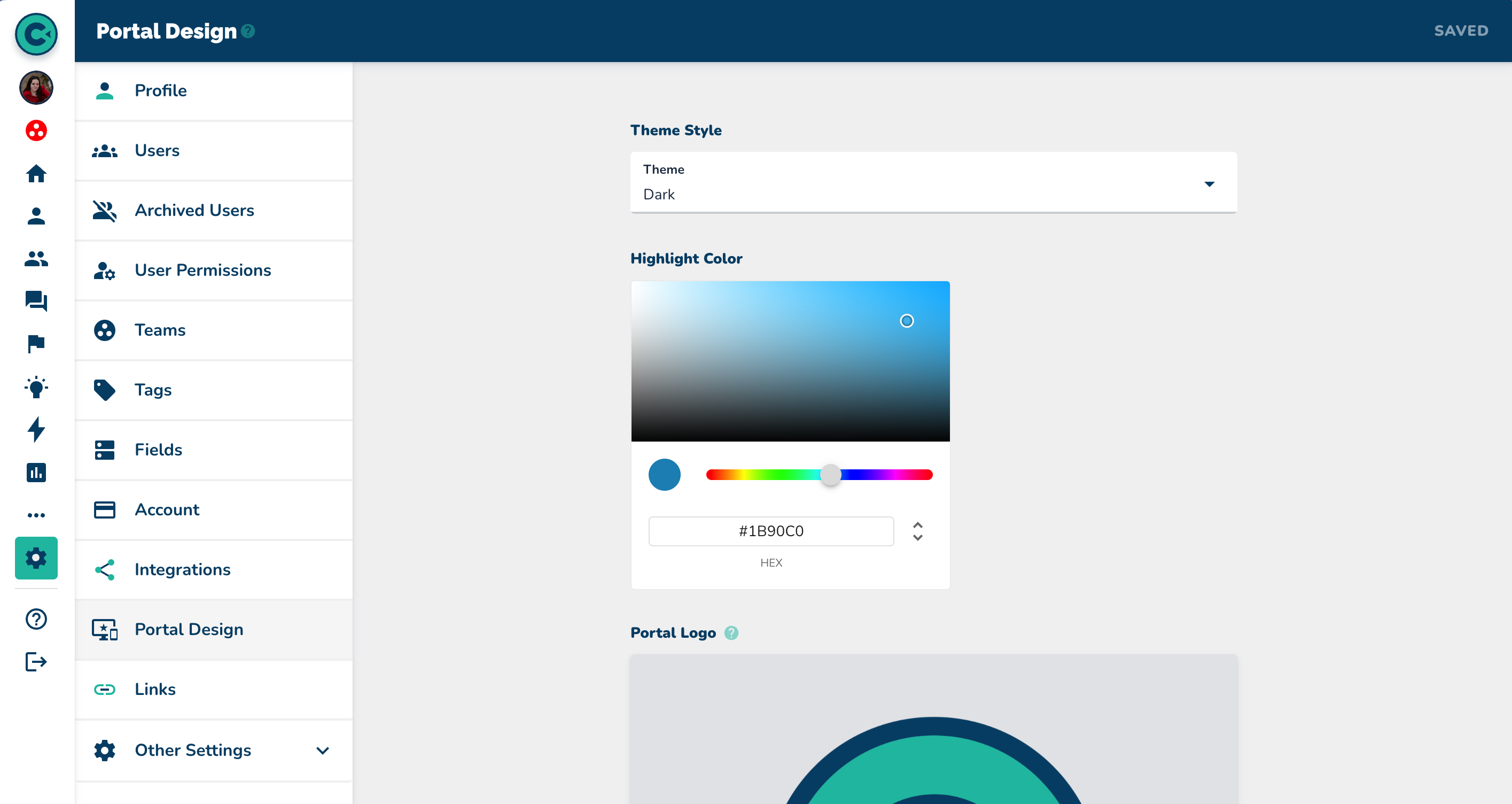 Pick your primary brand color as a hexadecimal value (e.g., #123456) and add it to Portal Color.