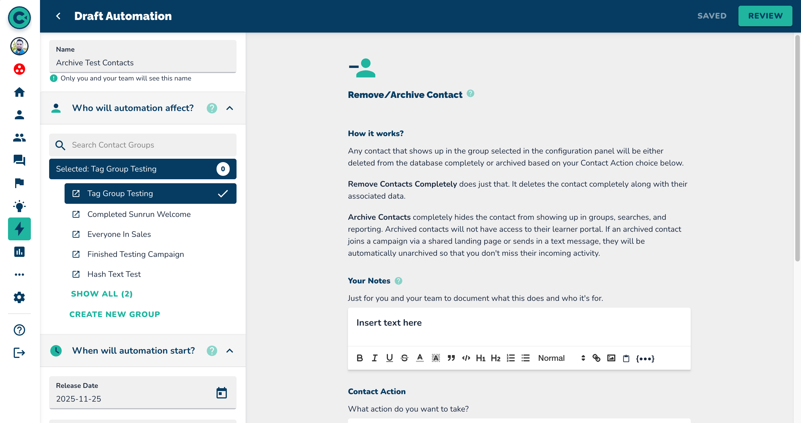 Ensure that you select "Archive Contacts" and NOT "Remove Contacts Completely" in the automation.